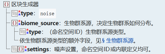 随后的区块生成器中的type字段我们一般会选择noise,因为我们需要用噪声生成更复杂的地形。而noise生成器又拥有这些字段: