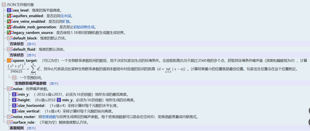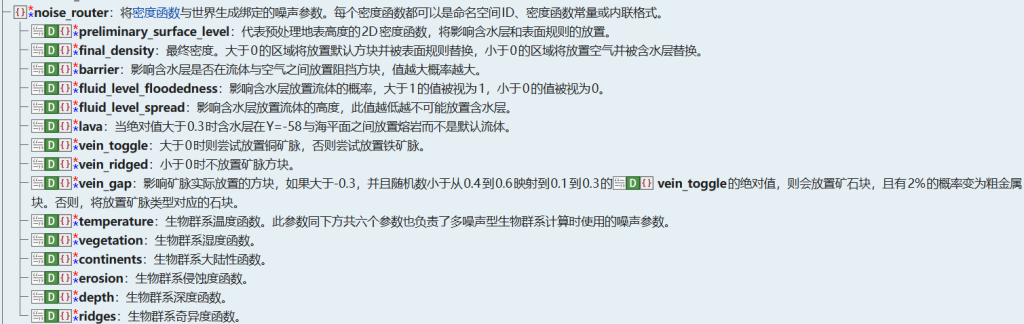 第一个部分是noise_router之前的内容(不包括),是一些地形生成的杂项,比如说海平面高度、含水层、矿脉相关的设定,对应了前文世界生成基本过程中的一些内容。noise字段决定了一些会应用到密度函数计算中的一些参数,在你学习密度函数的时候应该会注意到。