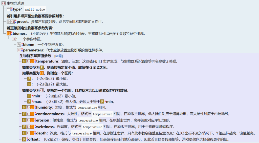 在维度设置中,我们还会定义生物群系的生成方式,即生物群系源。生物群系源同样也有不同的类型,但是一样的,我们一般会选择multi_noise类型。
