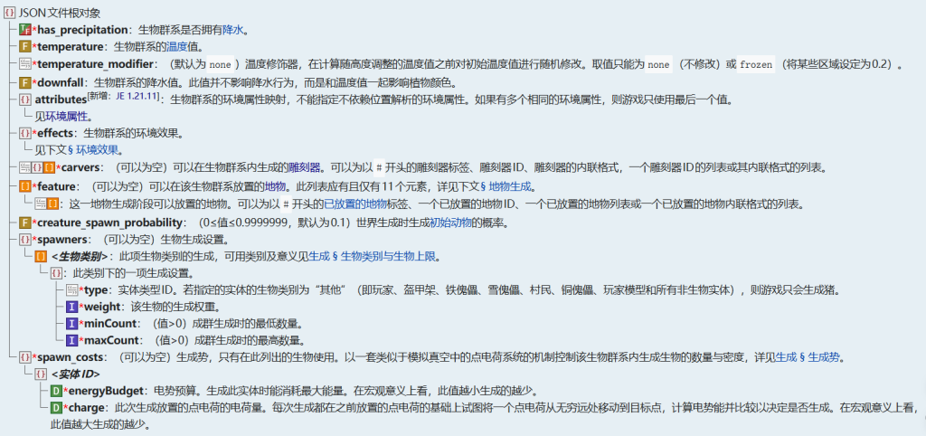 除了定义了生物群系是不是下雨、生物群系中生成什么动物以及环境属性以外,生物群系还定义了在这个群系中会使用哪些雕刻器,以及会生成哪些地物,这两个就是和我们自定义世界生成息息相关的字段。前者引用了自定义雕刻器,后者引用了自定义地物,自定义地物在本系列中有专门的章节说明,自定义雕刻器暂时还没有,具体的内容就请移步对应的章节或者对应的wiki页面啦,这里不多赘述,不然就变成超长的总教程了。