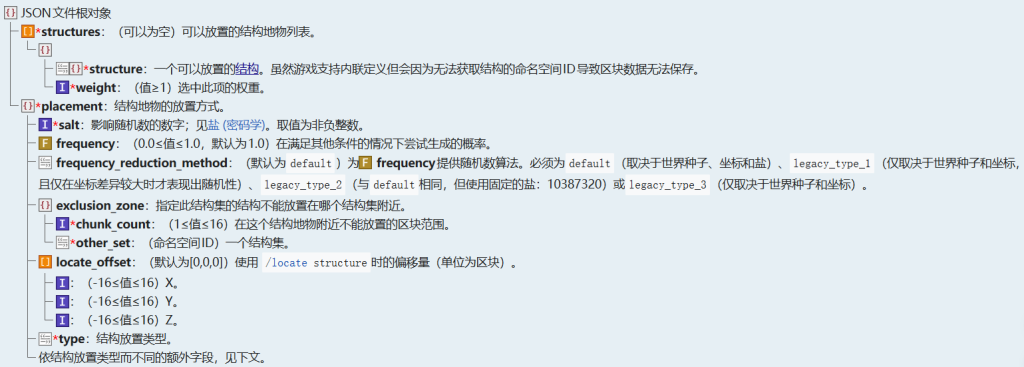 结构集定义在worldgen/structure_set文件夹中。它包含了一系列的结构,同时定义了这些结构应该怎么在世界生成阶段分散在世界中而生存。在世界生成阶段,每个维度都会尝试计算所有可用的结构集,在结构集计算的坐标上挑选可能的结构。如果当前位置的概率不通过,或不符合生物群系要求,或诸如地形限制等其他因素导致计算失败,则此处不会放置结构;否则,游戏会在区块内记录将要生成的结构片段,待区块加载时生成结构。locate structure命令在搜索结构的时候也是以结构集进行搜索的。