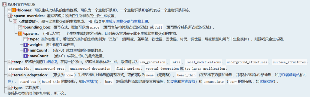 维度相关的内容就说完了,从生物群系到地形生成,我们似乎已经大致了解了地形生成的一切——什么,你说有东西没说?对啦,结构。结构并不是定义在维度设置中的,而是以结构集的概念被单独定义的。
